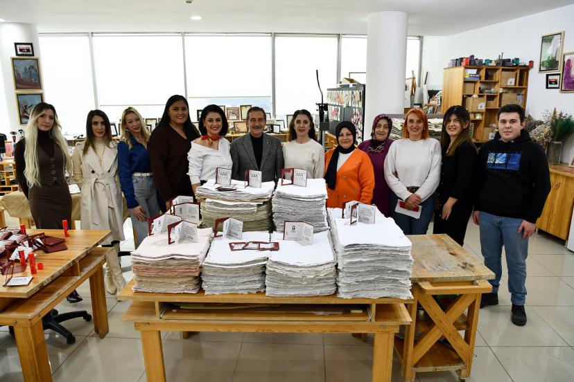 Belediye hizmet binalarında kullanılan ofis kâğıtları ile başkanlığa gelen çiçeklerin kurutularak değerlendirildiği atölyede, atıklar çeşitli işlemlerden geçirilerek önce hamura, ardından el yapımı kâğıtlara dönüştürülüyor. Bu kâğıtlar davetiye, sertifika, plaket ve tebrik kartı üretiminde kullanılıyor.