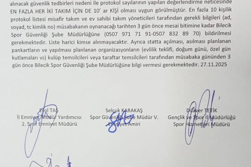 Kararın İl Spor Güvenlik Kurulu tarafından alınmadığı söyleyen kulüp başkanları karara itiraz etti. Vali veya vali yardımcısı başkanlığında bu kararın alınacak olması nedeniyle, karar ardından iptal edildi. 27 Kasım günü Emniyet Müdür Yardımcısı 2. Sınıf Emniyet Müdürü Erol Taş imzalı kararda, "İlimizde yapılacak olan futbol müsabakalarında 1 Ekim 2025 tarihli İl Spor Güvenlik Kurulu Kararlarında alınan misafir seyirci yasağına istinaden il ve ilçe statlarının fiziki şartları ve alınacak güvenlik tedbirleri nedeni ile protokol sayılarının yapılan değerlendirme neticesinde en fazla her iki takım için de 10’ar Kişi olması uygun görülmüştür. En fazla 10 kişilik protokol listesi misafir takım ve ev sahibi takım yöneticileri tarafından gerekli bilgileri (ad, soyad, tc kimlik no) müsabakanın oynanacağı tarihten 3 gün önce mesai bitimine kadar Bilecik Spor Güvenliği Şube Müdürlüğüne (bildirilmesi gerekmektedir. Liste harici kimse alınmayacaktır. Ayrıca statta açılması, asılması planlanan pankartların ve yapılması planlanan organizasyonların (evlilik teklifi, doğum günü, özel gün kutlamaları vs) kulüp temsilcileri veya taraftar temsilcileri tarafından müsabaka gününden 3 gün önce Bilecik Spor Güvenliği Şube Müdürlüğüne bilgi vermesi gerekmektedir" denildi.