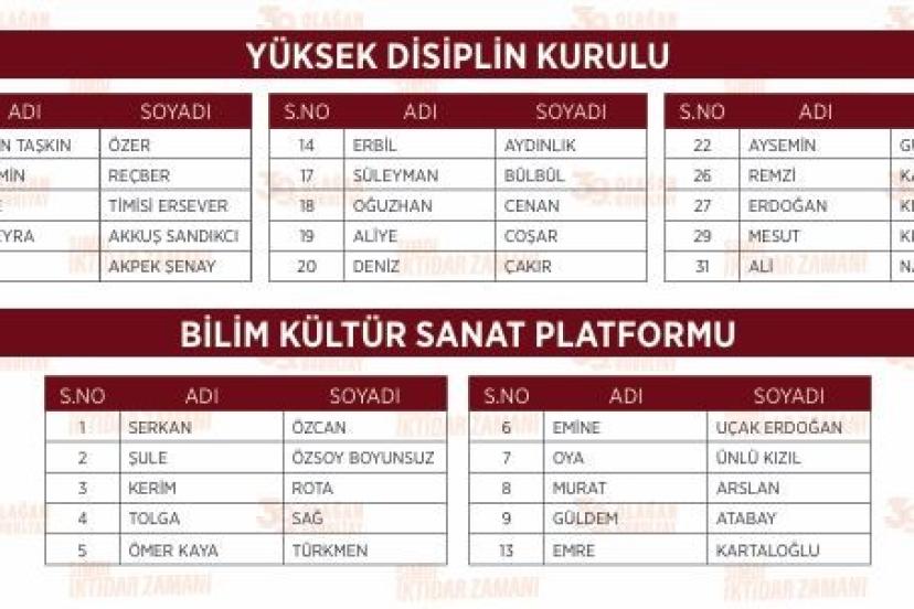 Bilim Kültür Sanat Platformu için ise anahtar listede; Serkan Özcan, Şule Özsoy Boyunsuz, Kerim Rota, Tolga Sağ, Ömer Kaya Türkmen, Emine Uçak Erdoğan, Oya Ünlü Kızıl, Murat Arslan, Güldem Atabay ve Emre Kartaloğlu yer aldı.
