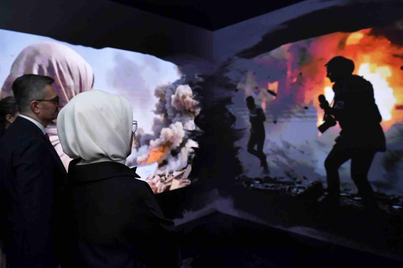 Emine Erdoğan, Cumhurbaşkanlığı İletişim Başkanlığı tarafından düzenlenen "Soykırımın Kadın Tanıkları: Gazze’de Medya ve Direniş" programına katıldı. İletişim Başkanlığına gelişinde Aile ve Sosyal Hizmetler Bakanı Mahinur Özdemir Göktaş ve Cumhurbaşkanlığı İletişim Başkanı Burhanettin Duran tarafından karşılanan Emine Erdoğan, İsrail’in Gazze’ye saldırılarında hayatını kaybeden gazetecilerin fotoğraflarının yer aldığı alanı gezdi. Programda konuşan Emine Erdoğan, bu anlamlı program vesilesiyle katılımcıları buluşturan İletişim Başkanlığına teşekkür etti. Filistinli gazeteci ve muhabirlerin yanı sıra Filistinli yönetmen Basel Adra’yı da misafir etmenin mutluluğunu yaşadıklarını belirten Emine Erdoğan, "Kıymetli kardeşim, öncelikle bilin ki siz, Türkiye’de yabancı bir ülkede değil, kendi evinizdesiniz. Burada misafir değilsiniz, ailenizle birliktesiniz. ’Başka Toprak Yok’ belgeseliniz, Oscar ve Berlin başta olmak üzere birçok film festivalinde ödül aldı. Ama siz çok daha büyük bir ödülün de sahibisiniz. O da tarihe bir hakikat savaşçısı olarak geçmenizdir. Belgeseliniz, Filistin davası gibi kelimelerin anlatmakta aciz kaldığı acılara ve onurlu Filistin halkının direniş mücadelesine tercüman oldu. İki senedir canlı yayında tüm dünyanın izlediği soykırımın yeni ve Gazze ile sınırlı olmadığını Filistin’in her karış toprağında bir asra yakın zamandır devam ettiğini uluslararası topluma duyurdunuz. Bu süreçte yaşadığınız zorlukları da biliyorum. Azminizden ve cesaretinizden dolayı sizi ve ekip arkadaşlarınızı yürekten kutluyor ve alkışlıyorum." diye konuştu. Bugün unutmamak ve şahit olduklarını konuşmak için bir arada olduklarını söyleyen Emine Erdoğan, hatırlamanın en büyük direniş olduğunu ifade etti. Emine Erdoğan, İsrail’in 2 yılda yaklaşık 300 gazeteciyi katlettiğini hatırlatarak bunların 37’sinin kadın olduğunu aktardı.