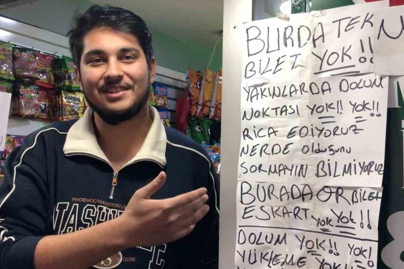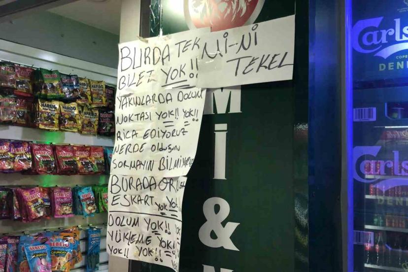 Üniversite Caddesi’nde bulunan bir market, toplu taşıma kartı olan ESKART ve tek kullanımlık bilet satışına yönelik sürekli gelen sorular nedeniyle bunalım yaşıyor. Bu duruma çözümü marketinin önüne astığı "Burada bilet yok, yakınlarda dolum noktası yok, rica ediyoruz nerede olduğunu sormayın bilmiyoruz, burada karekod bilet, ESKART yok, dolum yok, yükleme yok, yok yok yok yok" yazılarında bulan market sahibi Berkay Çetinkaya (23), bu hizmetleri bulundurmamasının sebebinin Büyükşehir Belediyesi’nin satışlardan yüzde 2 kâr vermesi olduğunu belirtti.