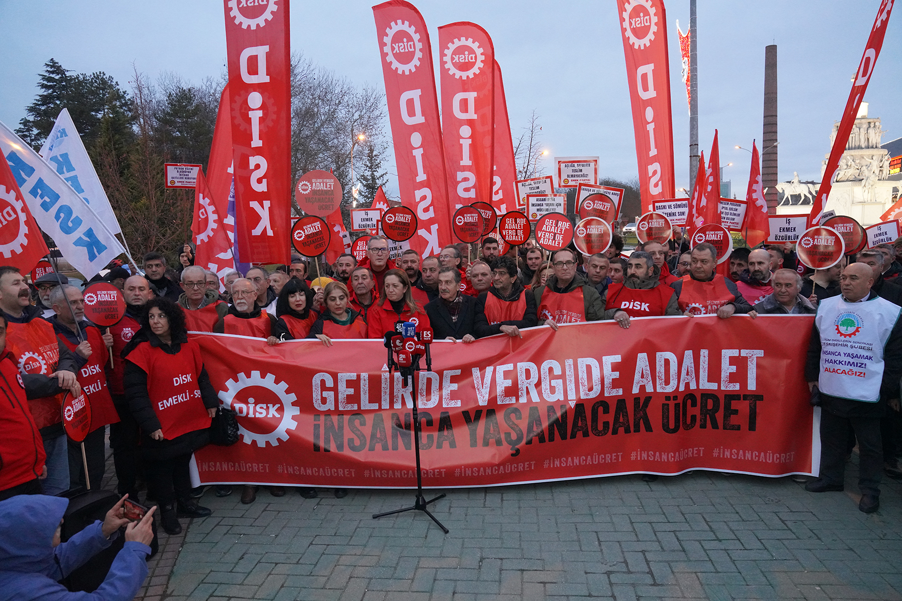 DİSK’in Kartal Meydanı’ndan başlayan ve Gebze, Kocaeli ile Bursa duraklarının ardından Eskişehir’e ulaşan yürüyüşü kapsamında İsmet İnönü-2 Caddesi’nde toplanan sendika üyelerini karşılayan Başkan Ataç, DİSK üyeleriyle birlikte Ulus Anıtı’na yürüdü. Burada gerçekleştirilen basın açıklamasında konuşan DİSK Genel Başkanı Arzu Çerkezoğlu, yürüyüşün amacının gelir dağılımında adalet ve vergide adalet talebini güçlü bir şekilde duyurmak olduğunu belirterek, “Bizi Eskişehir’de yalnız bırakmayan tüm sendikalı dostlarımıza ve her zaman yanımızda olan Tepebaşı Belediye Başkanı Ahmet Ataç’a teşekkür ediyorum.” dedi.
