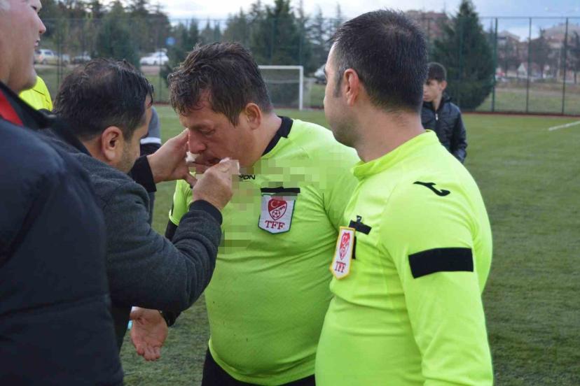 Eskişehir’de, Birlikspor-Eskişehir Kolej futbol takımları arasında oynanan amatör küme karşılaşmasında hakeme yönelik saldırı anı kameralara yansıdı.