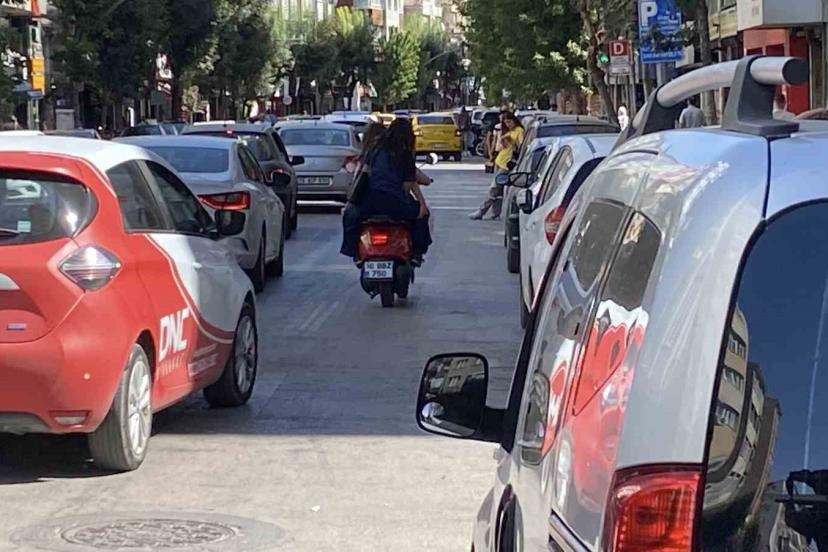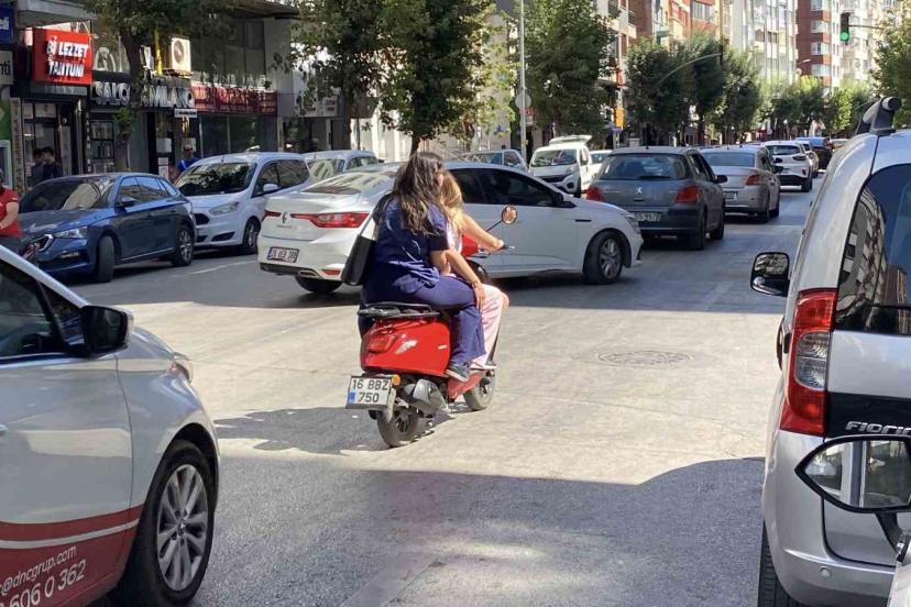 Eskişehir’de Cengiz Topel Caddesi’nde, kask veya güvenlik ekipmanı olmadan aynı motosiklete binen 3 kadın trafiğe tehlike oluşturdu. 26 BBZ 750 plakalı scooter tipi motosikletle seyreden kadınlar, Çarşı Polis Merkezi Amirliği önünden geçerken ilginç görüntüler oluşturdu. O anlar bir cep telefonu kamerasına yansırken, vatandaşlar tehlikeli yolculuğu şaşkınlıkla izledi.