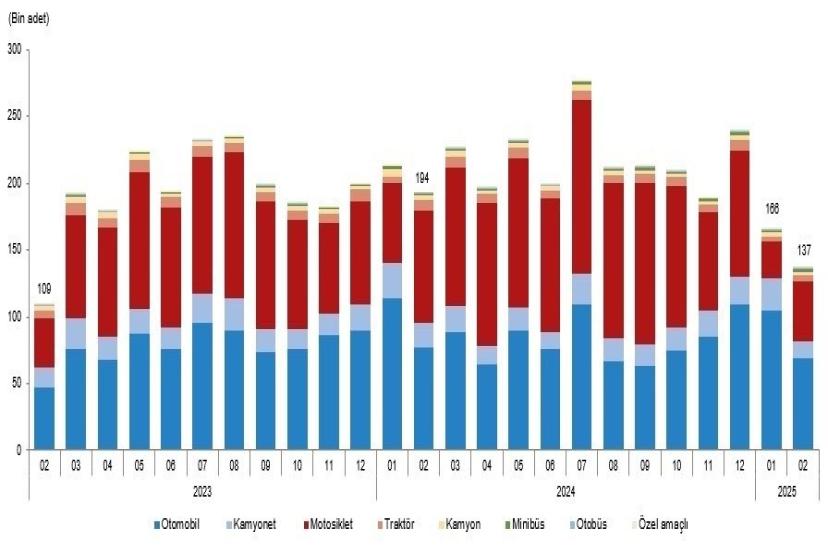 TÜİK, ’Motorlu Kara Taşıtları, Şubat 2025’ verilerini yayımladı. Paylaşılan bilgilere göre, yurt genelinde şubat ayında 136 bin 810 adet taşıtın trafiğe kaydı yapıldı. Kaydı yapılan taşıtların yüzde 50,2’sini otomobil, yüzde 32,7’sini motosiklet, yüzde 9,2’sini kamyonet, yüzde 3,3’ünü traktör, yüzde 2,2’sini kamyon, yüzde 1,5’ini minibüs, yüzde 0,8’ini otobüs ve yüzde 0,1’ini özel amaçlı taşıtlar oluşturdu.
