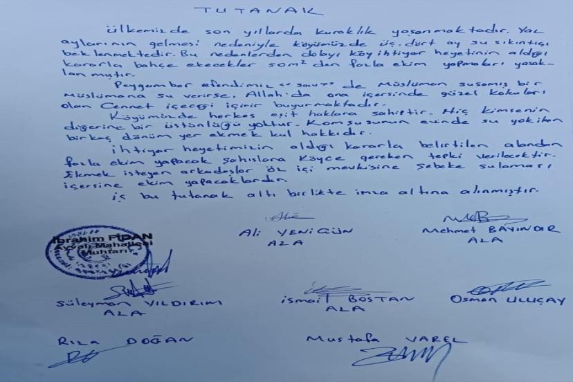 “Ülkemizde son yıllarda kuraklık yaşanmaktadır. Yaz aylarının gelmesi nedeniyle köyümüzde üç, dört ay su sıkıntısı beklenmektedir. Bu nedenlerden dolayı köy ihtiyar heyetinin aldığı kararla, bahçe ekeceklerin 50 metrekareden fazla ekim yapmaları yasaklanmıştır. Peygamber Efendimiz (SAV) “Müslüman susamış bir Müslümana su verirse, Allah da ona içerisinde güzel kokular olan cennet içeceği içirir” buyurmaktadır. Köyümüzde herkes eşit haklara sahiptir. Hiç kimsenin diğerine bir üstünlüğü yoktur. Komşusunun evinde su yokken birkaç dönüm yer ekmek kul hakkıdır. İhtiyar heyetimizin aldığı kararla, belirtilen alandan fazla ekim yapacak şahıslara köyce gereken tepki verilecektir. Ekim yapmak isteyen arkadaşlar, Öz İçi mevkiine şebeke sulaması içerisine ekim yapacaklardır.”