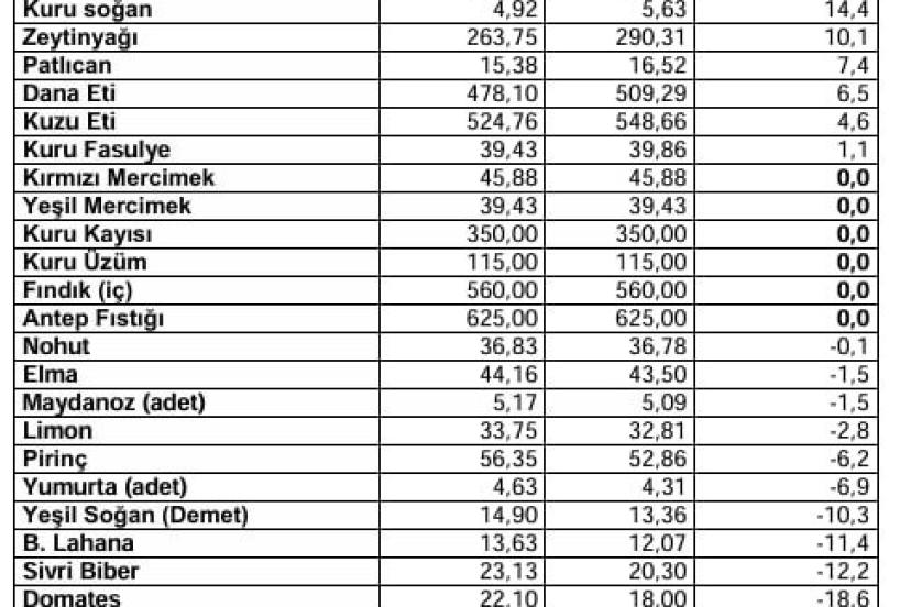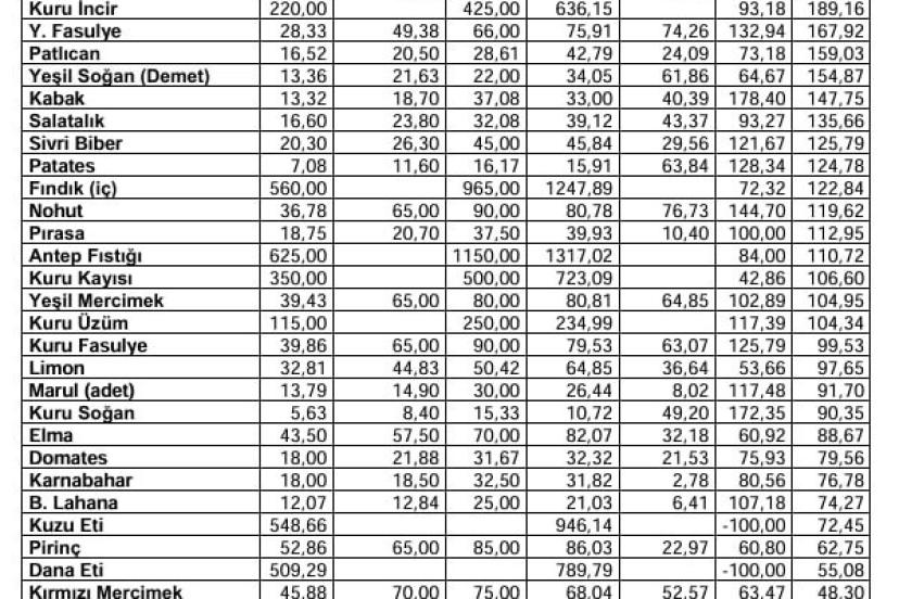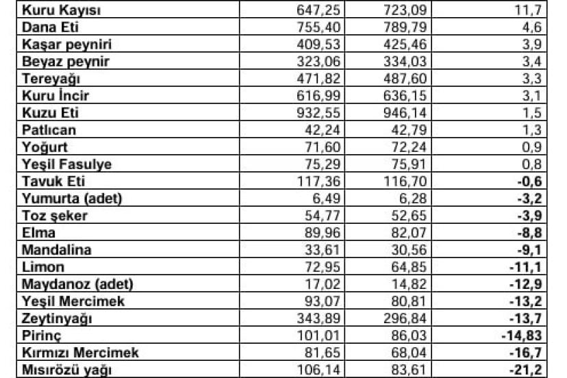Kasım ayında markette 42 ürünün 18’inde fiyat artışı, 24’ünde fiyat düşüşü olduğu açıklandı. Markette fiyatı en fazla artan ürün yüzde 149,5 ile pırasa olduğunun altı çizilirken, pırasadaki fiyat artışını yüzde 118,3 ile ıspanak, yüzde 71,7 ile fındık, yüzde 58,5 ile antep fıstığı takip etti. Markette fiyatı en fazla azalan ürün ise yüzde 55 ile marul oldu. Maruldaki fiyat düşüşünü yüzde 46,6 ile portakal, yüzde 43,3 ile kuru soğan izledi.