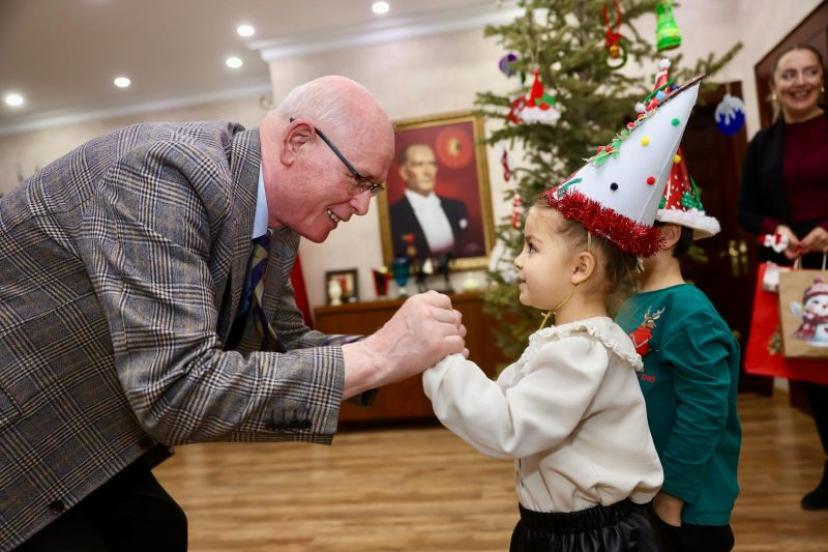 Çocuklarla yakından ilgilenen Başkan Kurt, onlarla sohbet ederek hatıra fotoğrafı çektirdi ve minik misafirlerin 2026 yılına dair dileklerini dinledi.