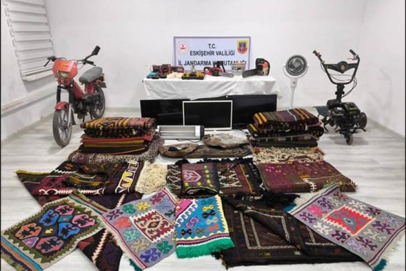 Eskişehir Günyüzü ilçesinde 04 Aralık tarihinden itibaren meydana gelen 20 evden hırsızlık olayının aydınlatılması maksadıyla Eskişehir İl Jandarma Komutanlığı JASAT Dedektif Timleri tarafından çalışma yapıldı. Yapılan çalışma neticesinde; olayları mahallede kendilerini mezar ustası olarak tanıtan 2 şüphelinin gerçekleştirdiği, çaldıkları malzemeleri Konya ve Ankara illerinde sattıkları tespit edildi. Şüphelilerin yakalanması ve çalınan malzemelerin ele geçirilmesi maksadıyla 10 Aralık tarihinde Konya ve Ankara illerinde 3 ikamet, 2 iş yeri ile 2 araçta icra edilen eş zamanlı operasyon sonucunda 2 şüpheli yakalanarak gözaltına alındı. Çalışmalarda çalınan malzemenin tamamı jandarma tarafından ele geçirildi. Çalınan malzemeler arasında; el emeği patik, testere, halı, matkap, çapa motoru ve vantilatör gibi malzemeler ise ‘pes’ dedirtti. Şüpheli şahıslar hakkında soruşturma başlatıldı.