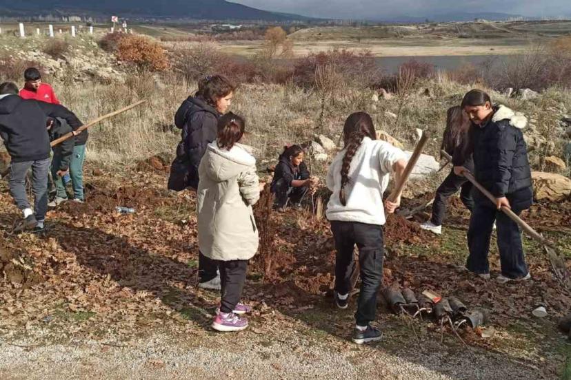 Öğrencilerle birlikte fidan diken protokol üyeleri doğayı korumanın ve yeşil alanları çoğaltmanın önemine dikkat çekti.