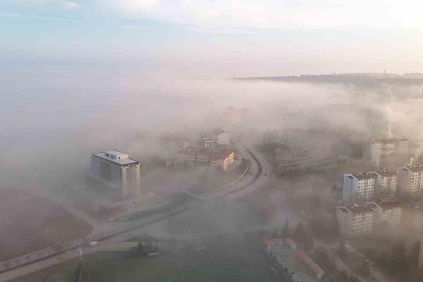 Eskişehir’de sabah saatlerinde etkili olan sis dron ile havadan görüntülenirken, kentin beyaz bir örtü ile kapladığı görüldü. Araç sürücüleri düşen görüş mesafesinden dolayı trafikte temkinli ilerledi.