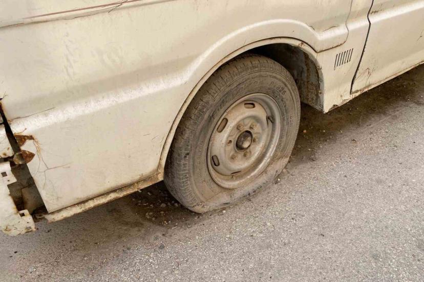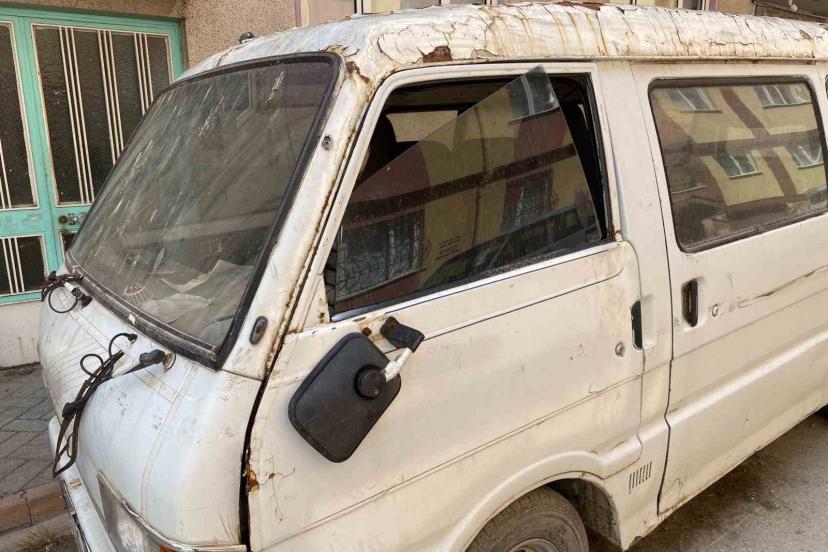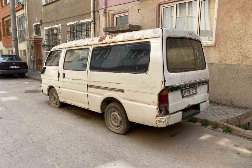 Lastikleri patlamış ve âtıl durumdaki panelvan tarzı araç, sokakta göze hoş olmayan görüntü oluşturuyor.