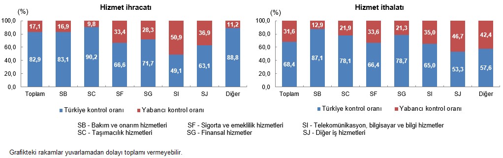 Verilere göre hizmet ihracatının %17,1’i, ithalatın ise %31,6’sı yabancı kontrollü işletmeler tarafından yapıldı. Taşımacılık hizmetleri ihracatının %90,2’si Türkiye kontrolündeki işletmeler tarafından gerçekleştirilirken, telekomünikasyon ve bilgisayar hizmetlerinde yabancı kontrollü işletmelerin payının %50,9 seviyesinde olduğu görüldü.