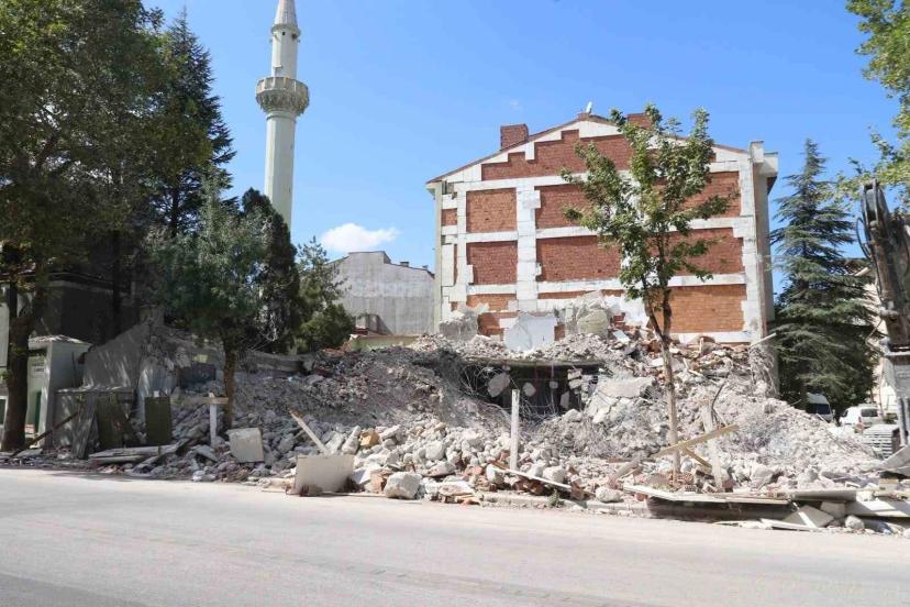 Yıkılan binanın molozları cami bahçesine döküldü