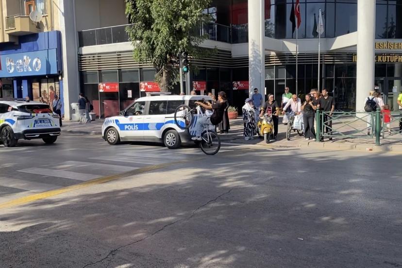 Eskişehir’de 30 Ağustos Zafer Bayramı kutlamaları çerçevesinde düzenlenen bisiklet turu sırasında polislerin gözü önünde tek teker kaldıran genç dikkat çekti.